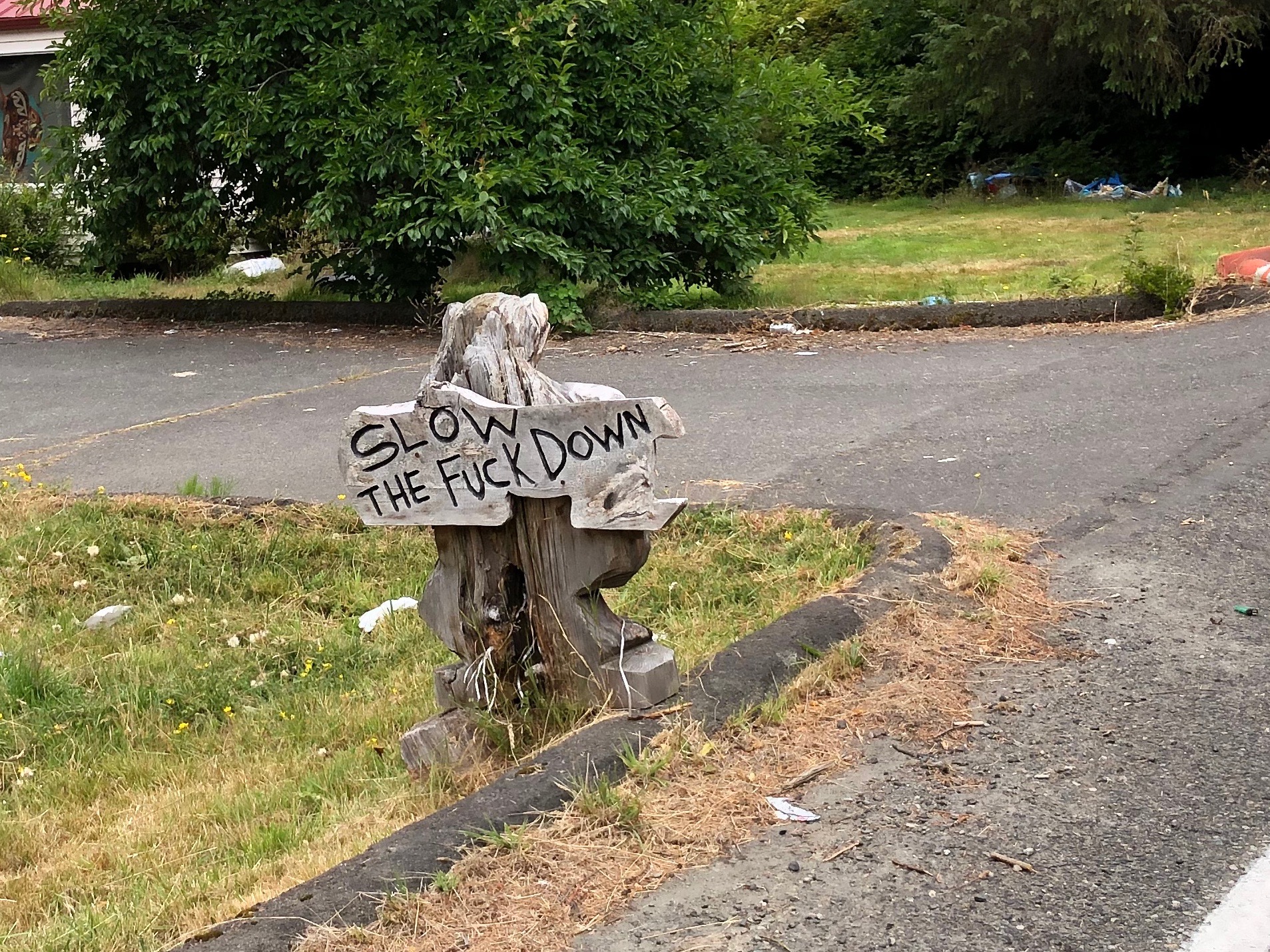 But all these traffic studies and investigations and speed limits and signs and so forth aren’t always enough in the real world. Sometimes people have to take matters into their own hands, in the form of a wooden board and a chisel, as seen in the 30 mph zone in Moclips.
